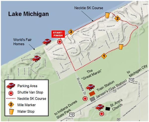 The Necktie 5K Walk & Run starts and finishes at Rebora Plaza (at the corner of Broadway and Lake Front Drive in